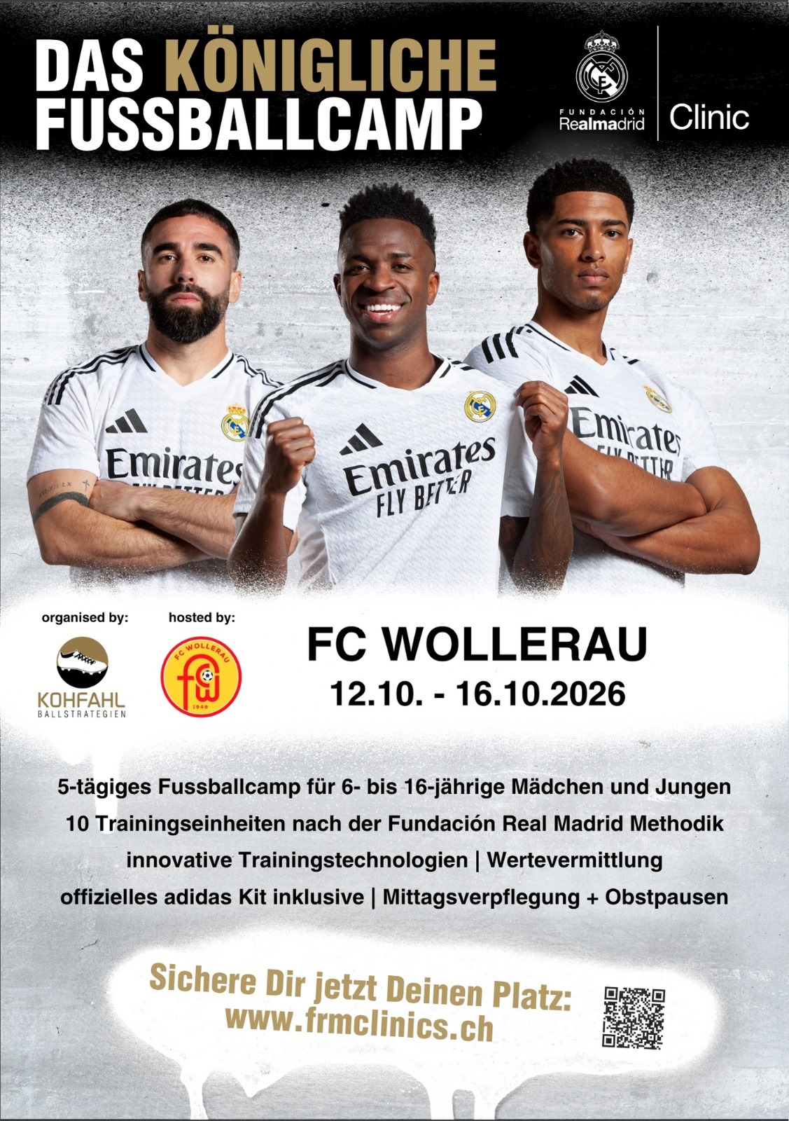 Real Madrid Camp in den Herbstferien vom 12.10.-16.10.2026 im Erlenmoos Dienstag, 17 Februar 2026Aktuelles An alle Juniorenmitglieder:innen des FC Wollerau Wir haben auch 2026 wieder ein besonderes Highlight für euch! Wie ihr möglicherweise schon mitbekommen habt, findet auch 2026 (Herbstferien vom 12.10.-16.10.2026) wieder das Fussballcamp von Real Madrid für Kinder von 6-16 Jahren bei uns statt. Und wir konnten mit den Verantwortlichen von Real Madrid einen besonderen Bonus für euch vereinbaren. Alle Kinder, die Mitglieder bei uns sind und am Camp teilnehmen, erhalten zusätzlich zum aktuellen Early Bird-Rabatt noch 50 CHF extra-Rabatt. Verwendet hierfür bei der Anmeldung im Gutschein-Feld den Rabattcode: FCWOLLERAU50 und bestätigt diesen. Die 50 CHF werden dann direkt vom Gesamtbetrag abgezogen. Insgesamt stehen uns 10 Rabattcodes zur Verfügung. Wer also schnell ist, kann mit dem aktuell noch gültigen Early Bird-Rabatt insgesamt 90 CHF sparen. Wir freuen uns, wenn ihr beim Camp dabei seid. Gerne könnt ihr natürlich auch euren Freundeskreis darauf aufmerksam. Weitere Infos und Anmeldung unter: www.frmclinics.ch SHARE: FacebookTwitterWhatsApp